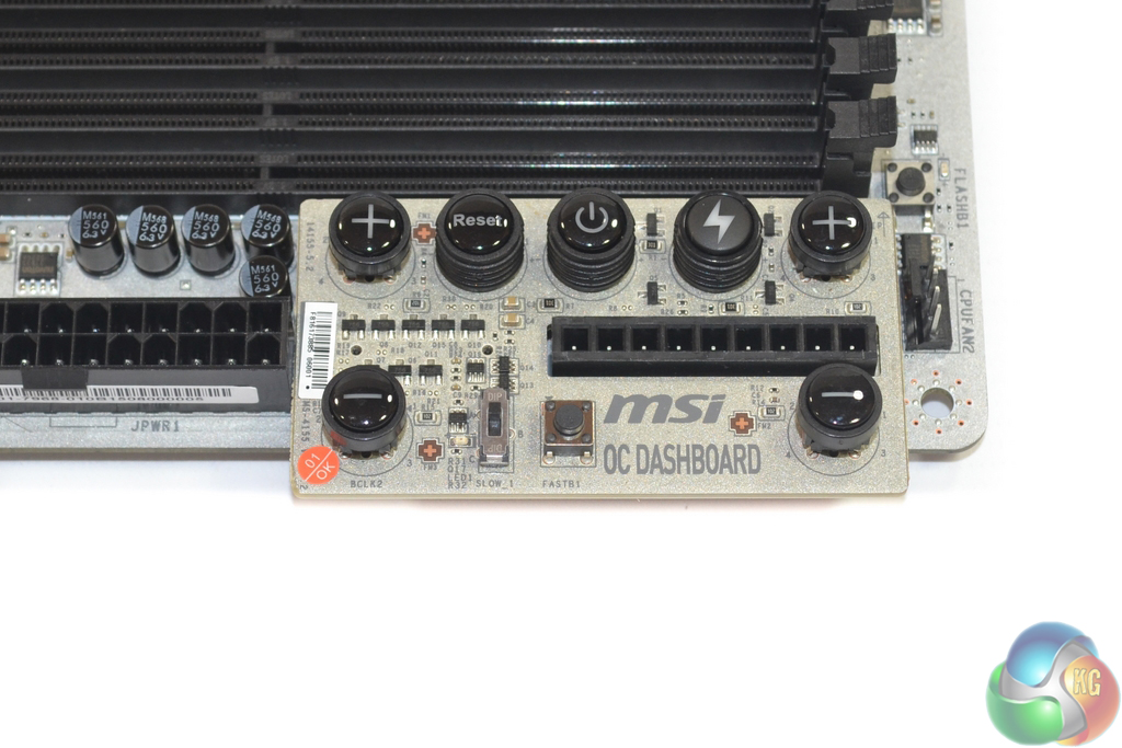 MSI's OC Dashboard is able to sit directly on the motherboard or it can be positioned elsewhere thanks to the included cable. That latter point is useful for sub-zero overclockers because the memory slots regularly freeze during an extended session of even CPU-only LN2 benching.