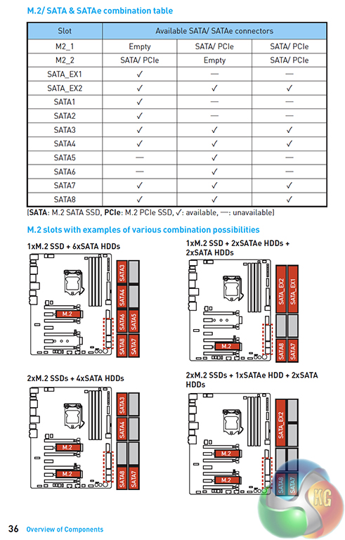 Thankfully, the vendor includes a convenient table and images showing possible usage distributions for storage devices. For example, a pair of high-speed PCIe 3.0 x4 SSDs could be used in RAID 0 while also running a USB 3.1 front panel implementation through SATA-Express and maintaining the pair of ASM1061 SATA 6Gbps ports for slower storage drives.