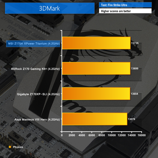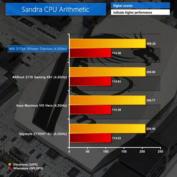 MSI's Z170A XPower Gaming Titanium Edition delivers strong results in CPU-heavy 3DMark and Sandra Arithmetic tests thanks to its slight increase in default CPU clock speed.