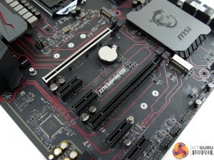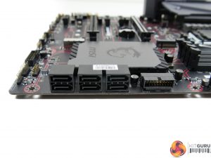 Six right-angled SATA 6Gbps ports are all provided by way of the Z270 chipset. Sat next to those ports is one of the board’s two internal USB 3.0 5Gbps headers for connection to a case. Its right-angled orientation is ideal for users trying to hide the fat USB 3.0 header cable when trying to conduct cable management.