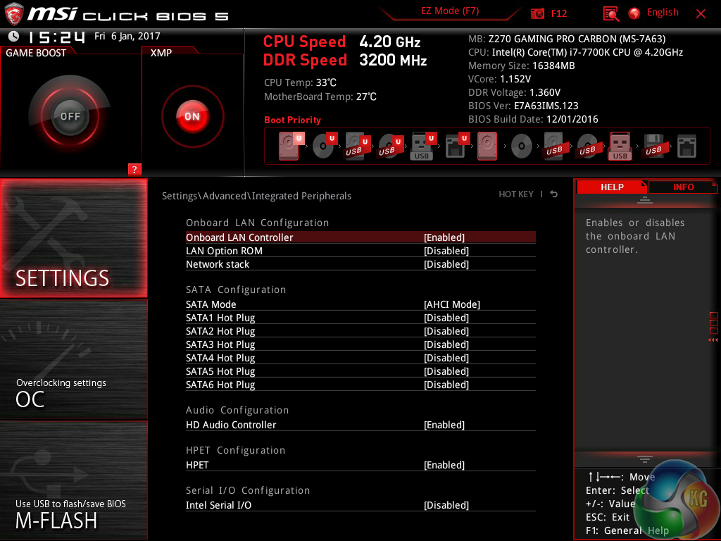 Hitting F7 takes a user into the Advanced section. There are few changes from MSI's previous UEFI implementations and the general layout is well-described and easy to follow. Six tabs house all of the adjustable settings, with information and boot device adjustment being held at the top of the page.