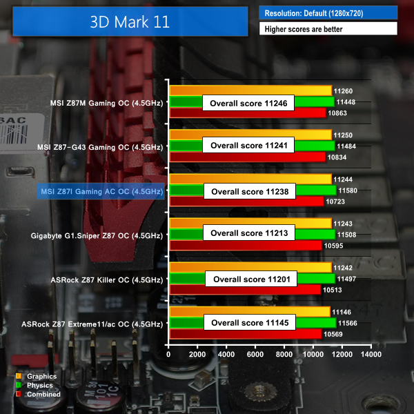 When overclocked, MSI's Z87I Gaming AC delivers strong performance in 3DMark 11.