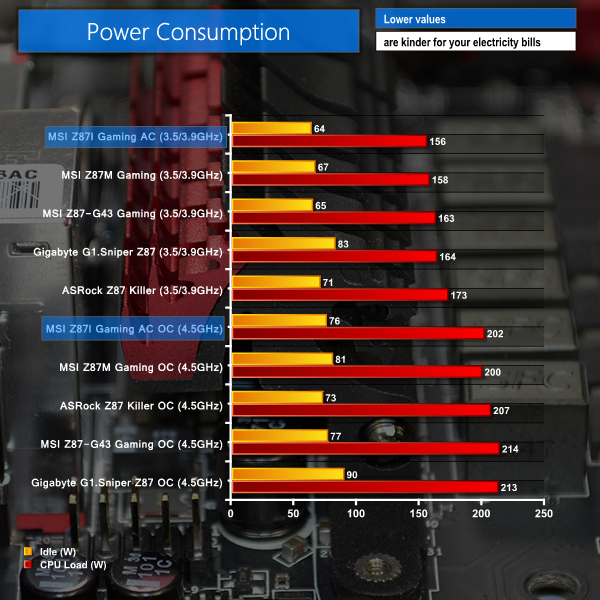 Power consumption levels for the Z87I Gaming AC are the lowest that we have recorded for our updated LGA 1150 test system. This doesn't come as much of a surprise; the board's physically smaller form factor and strong power delivery system helps to minimise current losses and reduced efficiency.