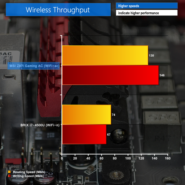 Using a pair of antennae and a strong wireless chipset in the Intel 7260, MSI's Z87I Gaming AC is able to deliver the best wireless throughput speeds that I have recorded with our Tenda-based hardware to date.