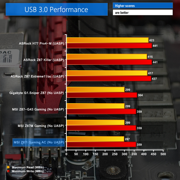 USB 3.0 throughput numbers are exactly as we would expect for a motherboard without a UASP-activating software tool. As we have pointed out many times in the past, the relevance of the substantial speed deficit, compared to ASRock's and Asus' offerings, will be related to an individual's usage scenarios.