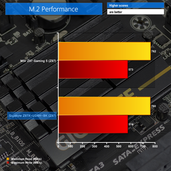 By using ports routed directly from the Z97 chipset, performance of all SATA 6Gbps connections on MSI's board is limitless for modern SSDs operating from the interface.