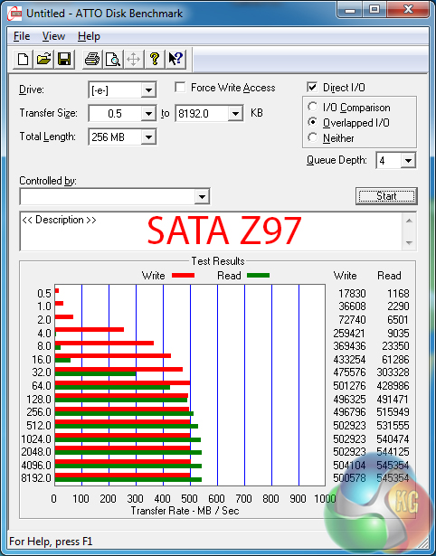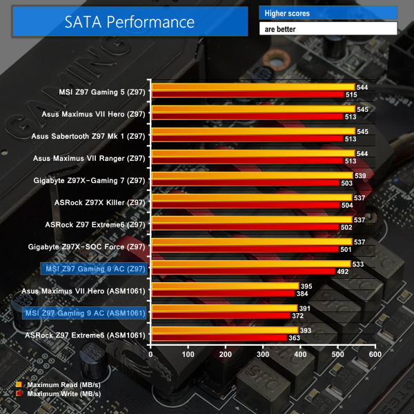 Although MSI's Z97 Gaming 9 AC seems to take a bottom spot, of sorts, with its Z97 SATA speed, degradation on our ageing Kingston SSD has a role to play in the results. Even with that said, performance differences between all Z97-based SATA connections are relatively small.