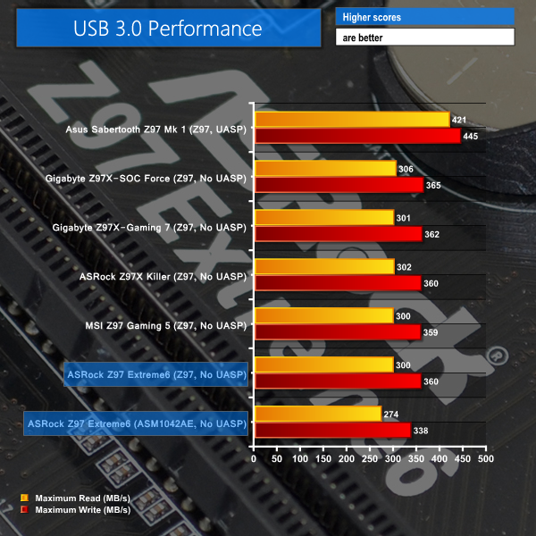 Speed of the ASM1042AE USB 3.0 ports is slightly lower than the Z97-based alternatives. MSI's inclusion of the add-on ASMedia chipset is purely to bolster the board's total number of the SuperSpeed connections.