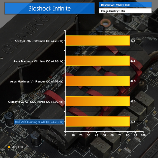 MSI's motherboard makes solid gains with the 300MHz overclock applied. Cinebench and 3DMark scores fair well with the boosted CPU frequency, although Bioshock Infinite's GPU-heavy workload doesn't benefit from the faster processor speed.