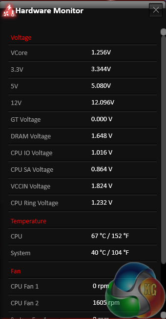 MSI uses the standard voltage level of around 1.23V VCore for the 4790K at its MCT frequency. With a load applied, the core voltage peaks at 1.256V, which is a fair level for a 4.4GHz clock speed and should be safe with most decent air coolers.