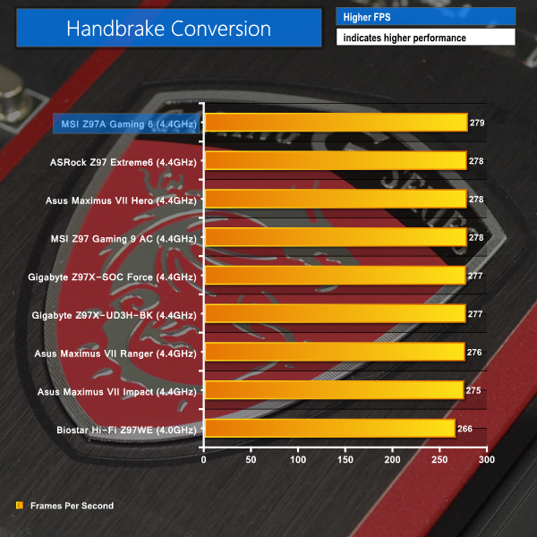 A strong conversion results is shown by the Z97A Gaming 6 in our testing. The board leads the competing pack with a margin of one FPS or greater.