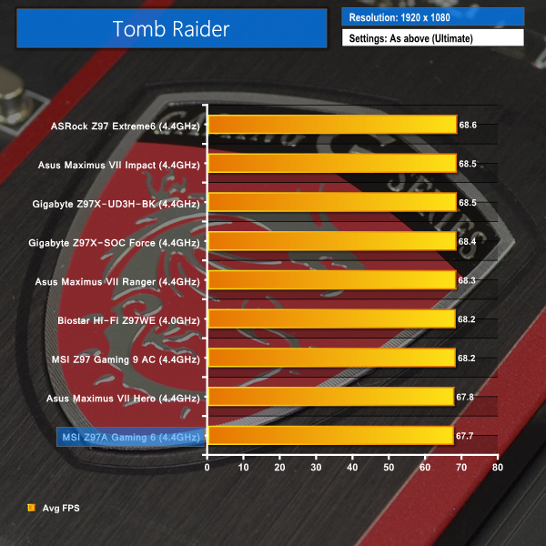Despite two bottom-place finishes, there is no cause for concern by the MSI Z97A Gaming 6 motherboard's frame rate performance. The narrow defeat in Bioshock Infinite is by no more than a few tenths of a frame. Tomb Raider performance is about half a frame behind the majority of our comparisons, although this could be related to subtle differences in the test system's operation.