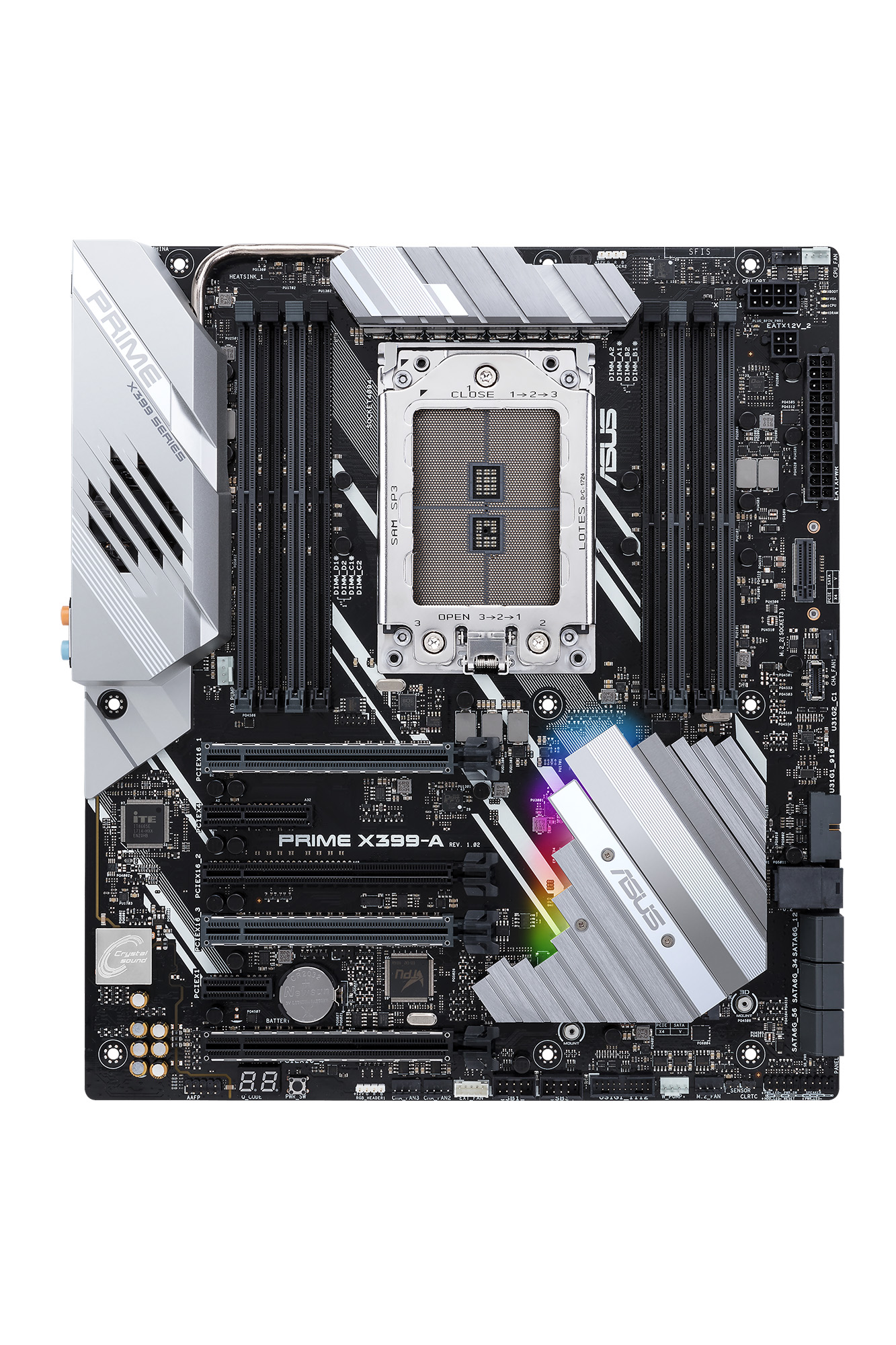 Finally, the ASUS Prime X399-A is also on the way. This board places Threadripper in a more professional setting, with the board taking on a black and silver look without the fancy ROG styling. This particular board can also support up to three graphics cards, though there are four PCIe slots in total, all linked to the CPU. The primary M.2 slot on this board shares a heatsink with the chipset and a secondary M.2 slot can be found closer to the RAM slots. There is also a U.2 port, so there is plenty of room for solid state drive expansion.