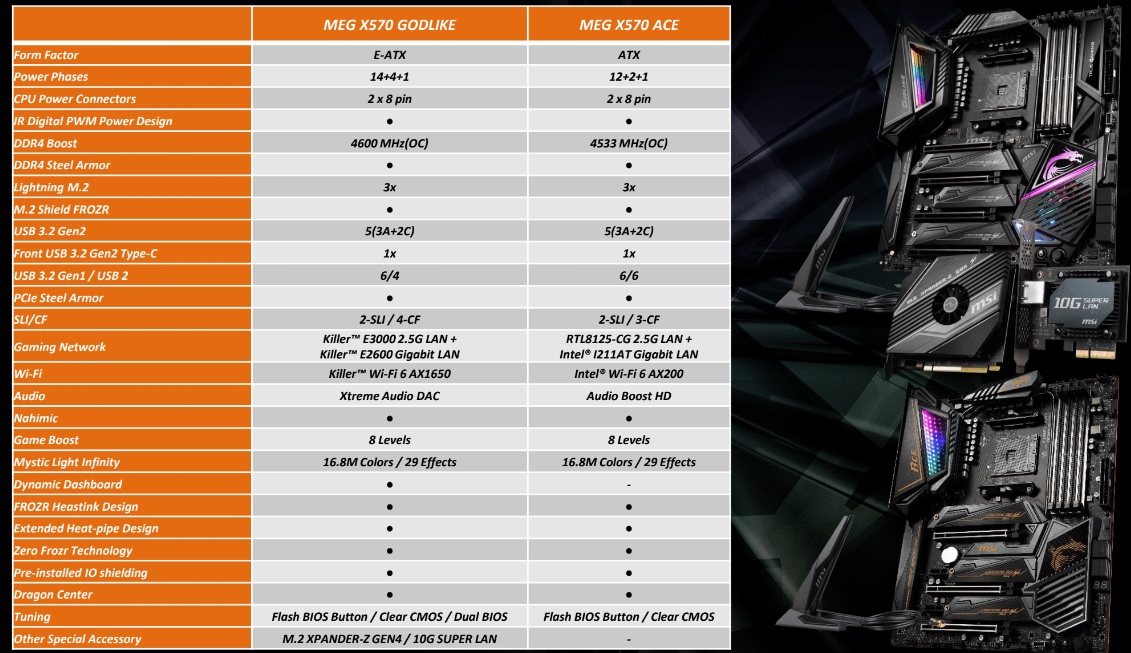 The MEG X570 ACE is the next step down and is a standard ATX board. This one has DDR4 overclocking support for speeds of up to 4533MHz. It also supports WiFi 6 but instead of Killer, the Ace uses Intel's AX200 chip. The LAN ports are different too, with wired networking coming via RTL8125-CG 2.5G LAN + Intel i211AT Gigabit LAN. You still get three M.2 SSD slots but multi-GPU support is dropped to 2-way SLI or 3-way Crossfire.