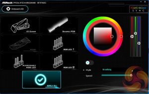 ASRock Polychrome RGB seems to be a rebranding of the previous ASRock AURA RGB, perhaps due to naming similarities with the ASUS AURA RGB solution. The new software is a little bit slicker with handy visualisations of each of the available zones that can be altered – on this board there are three RGB headers and two onboard RGB lighting zones.