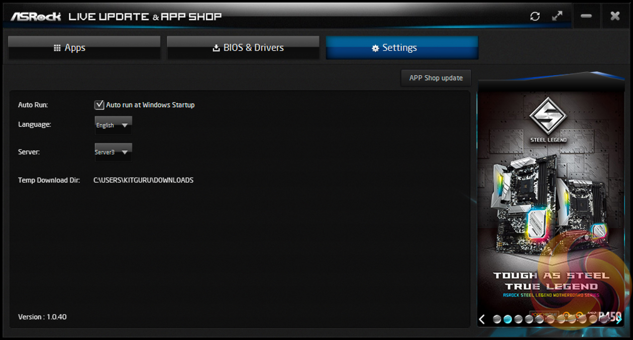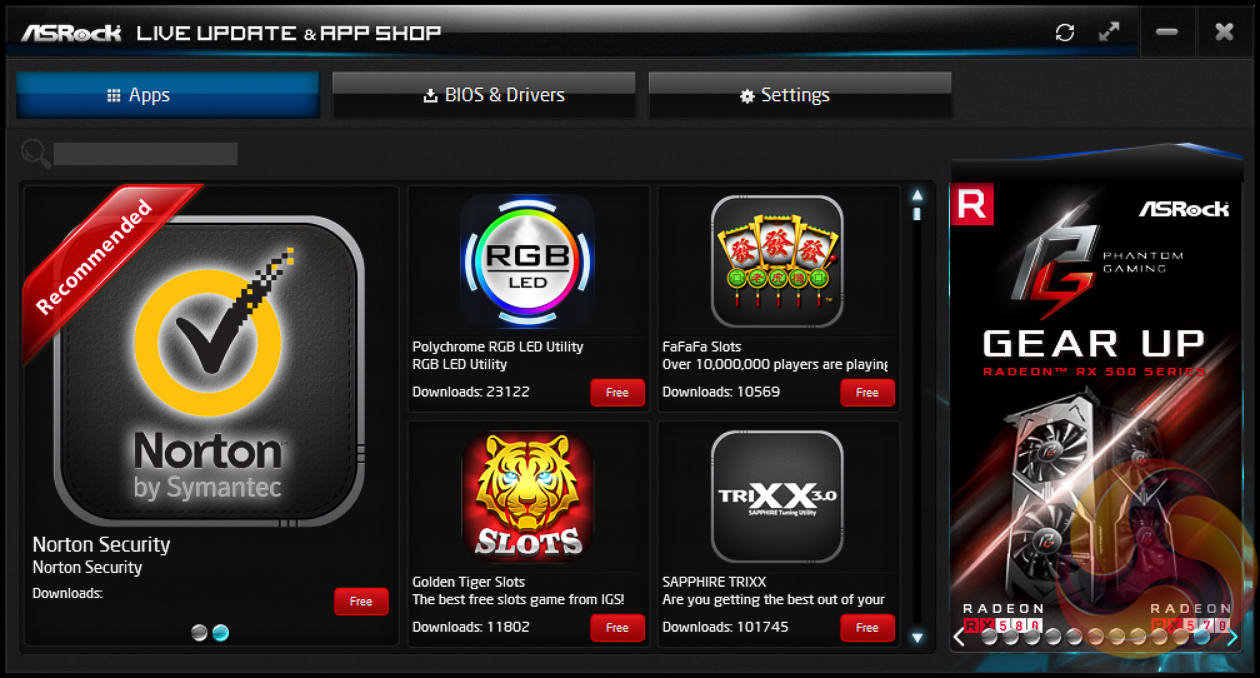 ASRock’s App Shop provides the dual role of serving out ASRock’s own software and approved third party software (some of dubious value), but also includes a MSI Live Update-style function which scans for certain BIOS and driver versions and informs the user when a newer version is available.