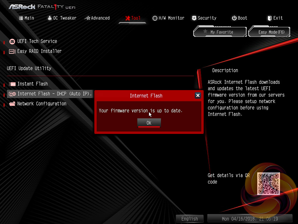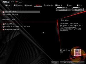 The Tool tab holds the Instant Flash utility which is beautifully simple; attach a USB device, pick the update file and update, or update automatically from the internet. ASRock has removed the in-UEFI RGB controls for this motherboard from the tools section so all controls are done in the software environment, which we'll cover later.