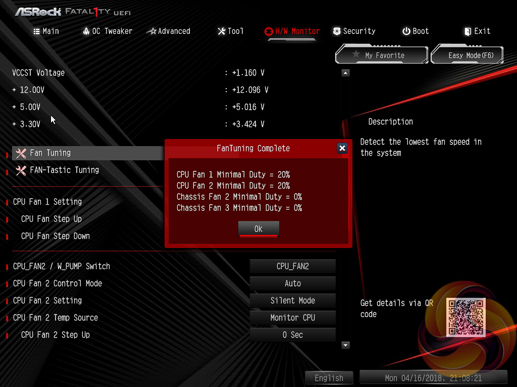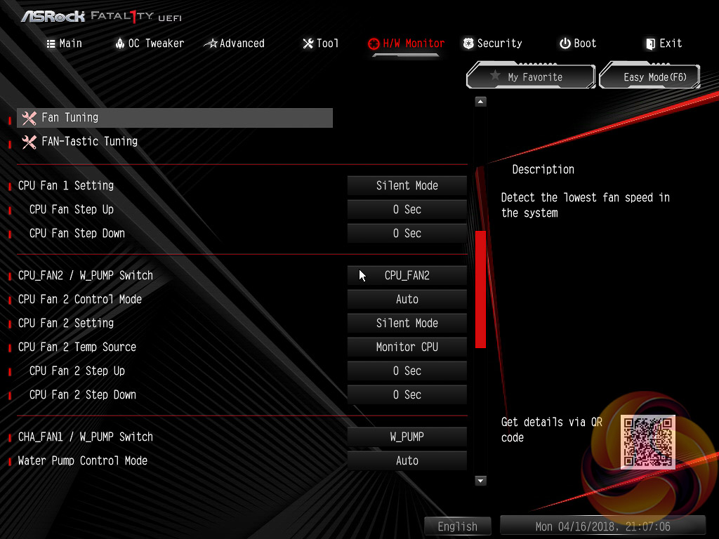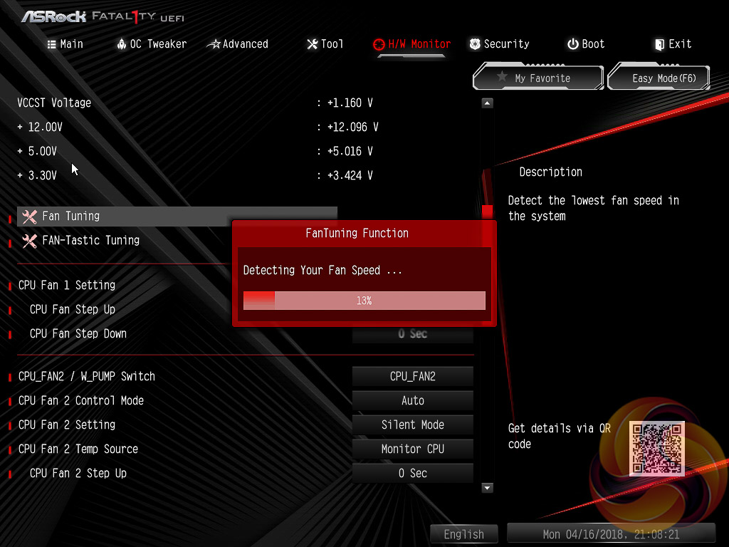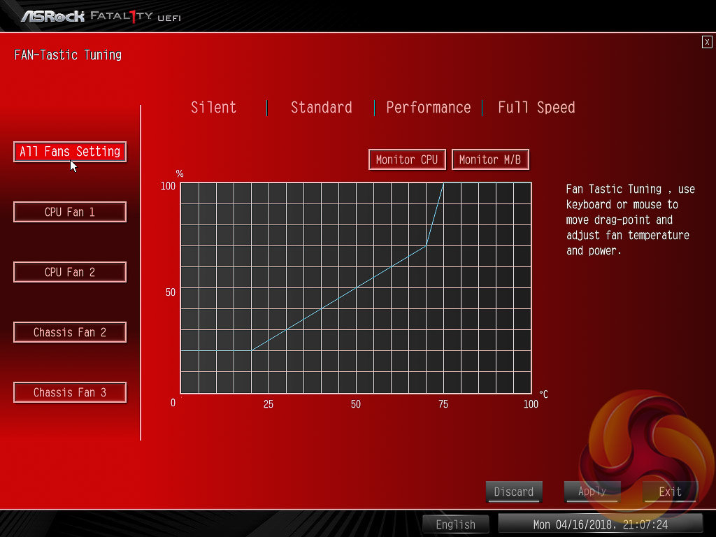 The Monitor section includes a number of voltage, temperature and fan speed read-outs as well as all the CPU and System fan controls. Further fan tuning can be done by first running the “Fan Tuning” wizard to calculate the full fan speed range of each attached fan (minimum and maximum speeds in RPM). Then from within the FAN-Tastic tuning window customised profiles can be set using the fan speed graph and the mouse to drag-and-drop the graph's line.