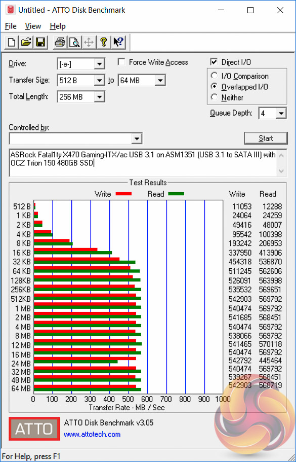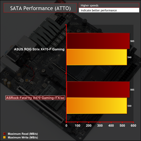 For the ASRock X470 ITX motherboard we had compatibility issues between its only USB 3.1 Type-A port (via the AMD X470 chipset controller) and the ASM1352R RAID box and thus we were unable to get results on our standard test equipment. It proved impossible to get to the bottom of this issue and we were not able to get a single successful benchmark run despite trying a second ASRock motherboard, a different ASRock ASM1352R based RAID board, a fresh install of Windows 10, numerous UEFI versions, different drivers and AMD firmwares and many different power and BIOS options.