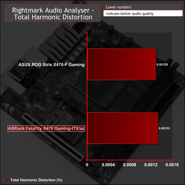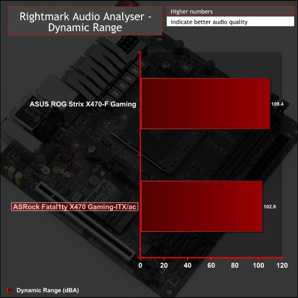 The performance is in line with what we've seen from other Realtek ALC1220 codec based motherboards including Z370 motherboards using the same codec. The performance for the ASRock X470 mini-ITX motherboard was a little bit worse than the ASUS X470-F motherboard, probably reflecting the higher congestion on the PCB and fewer audio capacitors in use due to space constraints.