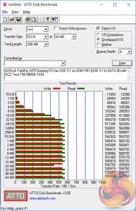 The ATTO disk benchmark is a Windows-based utility for testing storage performance of any storage drive or controller. We use the default benchmark setup.