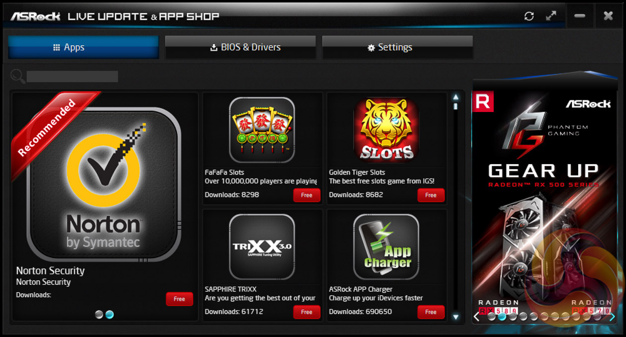 ASRock’s App Shop provides the dual role of serving out ASRock’s own software and approved third party software (some of dubious value), but also includes a MSI Live Update-style function which scans for certain BIOS and driver versions and informs the user when a newer version is available. It’s reasonably useful for both of its provided functions and isn’t too intrusive, but does pop up the occasional notification in Windows 10.