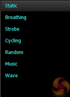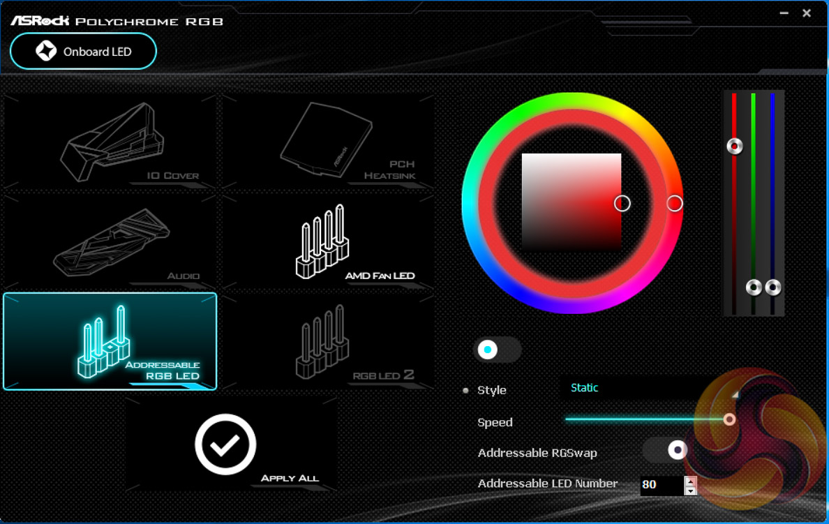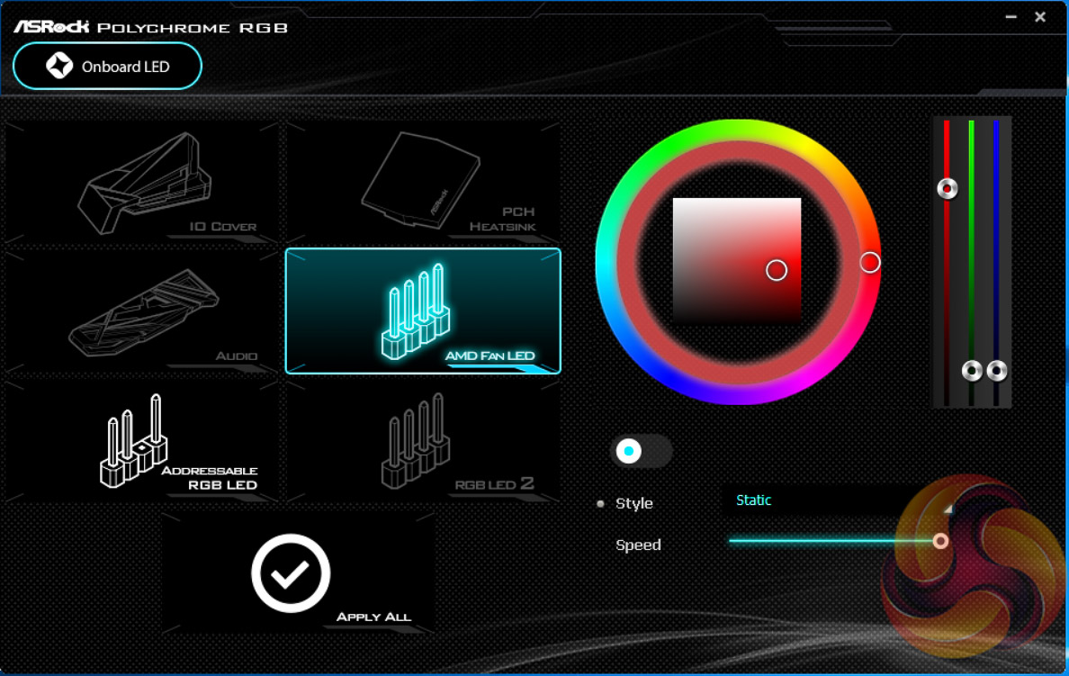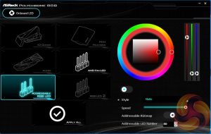 ASRock Polychrome RGB seems to be a rebranding of the previous ASRock AURA RGB, perhaps due to naming similarities with the ASUS AURA RGB solution. The new software is a little bit slicker with handy visualisations of each of the available zones that can be altered – on this board it's those two RGB headers only. The way the colours and modes are changed is the same as predecessor software. It works by selecting the colour on the outer ring first, then the inner square after and then you can pick the style from the drop down menu, there are currently 7 modes as shown above.