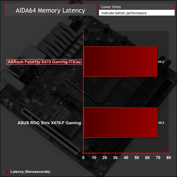 Memory performance was very similar between the two X470 motherboards on test, with the variation that we did observe possibly down to the fact the ASRock X470 ITX motherboard was only using two memory modules (ITX form factor limitation) compared to the four memory modules on the ASUS X470-F motherboard.