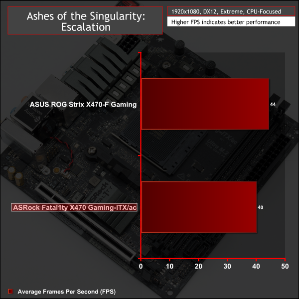 Gaming performance was mostly similar but the ASUS X470-F motherboard seemed to have a slight edge in some tests – perhaps down to more memory, a better VRM facilitating faster frequencies or some other explanation such as random testing error.