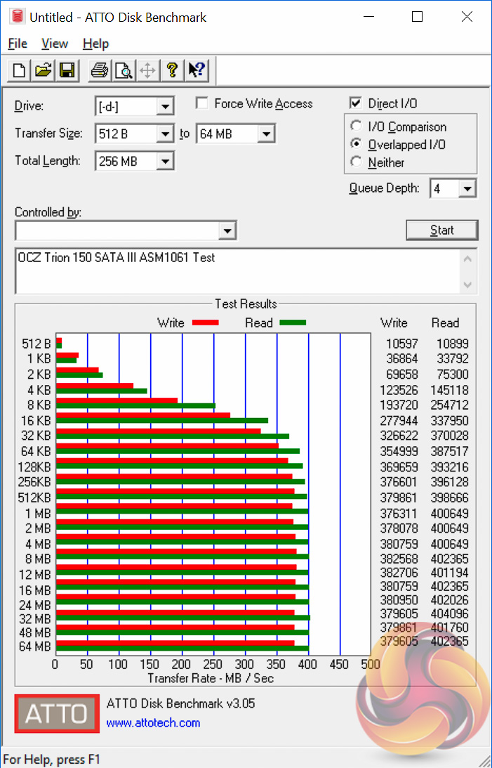 The ATTO disk benchmark is a Windows-based utility for testing storage performance of any storage drive or controller. We use the default benchmark setup.