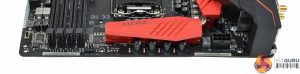 The power delivery system on this board uses an 8+4+2 (CPU+iGPU+VCCSA/VCCIO) phase design for a total of 14 phases. This is a little better equipped than some of the competition, such as the MSI Z270 Gaming M7, and the overall quality of the components is high with the use of 60-amp power chokes (inductors) and Nichicon 12K-rated capacitors.