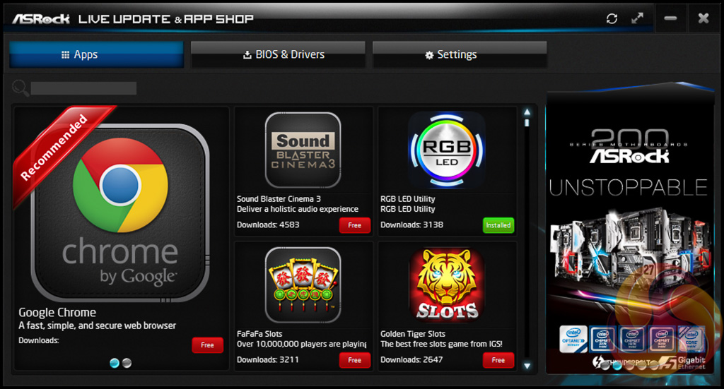 ASRock’s App Shop provides the dual role of serving out ASRock’s own software and approved third party software, but also includes a Live Update-style function which scans for certain BIOS and driver versions and informs the user when a newer version is available. It’s reasonably useful for both of its provided functions and isn’t too intrusive, but does pop up the occasional notification in Windows 10.