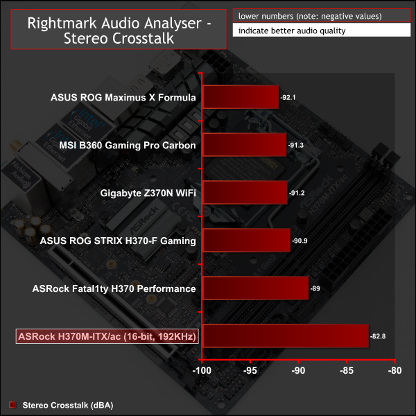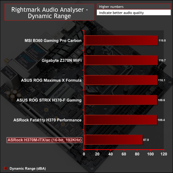 Audio performance is lower than all other motherboards on test since the H370M-ITX/ac uses the slightly older Realtek ALC892 codec. Most mid-range to high-end modern motherboards usually have Realtek ALC1220 but ASRock positions this motherboard as entry-level hence the older codec.