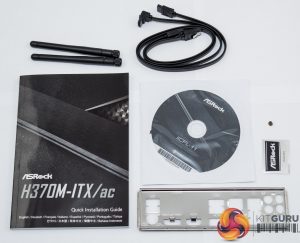 The accessory bundle is simple too – a couple of SATA cables, the WiFi antennae, an I/O shield, M.2 screw, case sticker, user manual and driver/utility DVD.