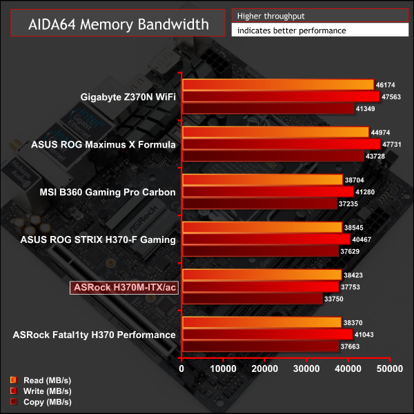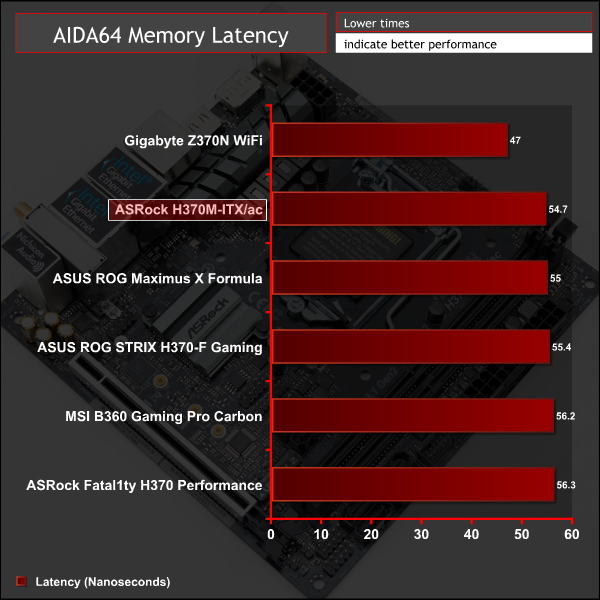 Memory performance takes a hit compared to other H370 motherboards since memory throughput is linked to CPU frequency which is lower due to a conservative UEFI power limit.