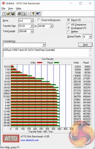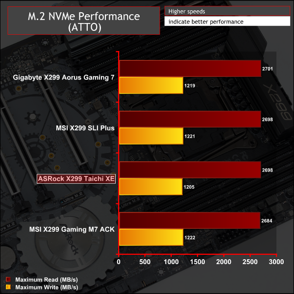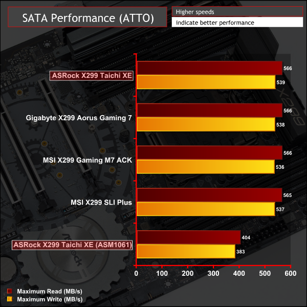 SATA performance was standard for the X299 chipset ports (0-7) while the two ports on the ASMedia controller performed about 150MB/s slower.