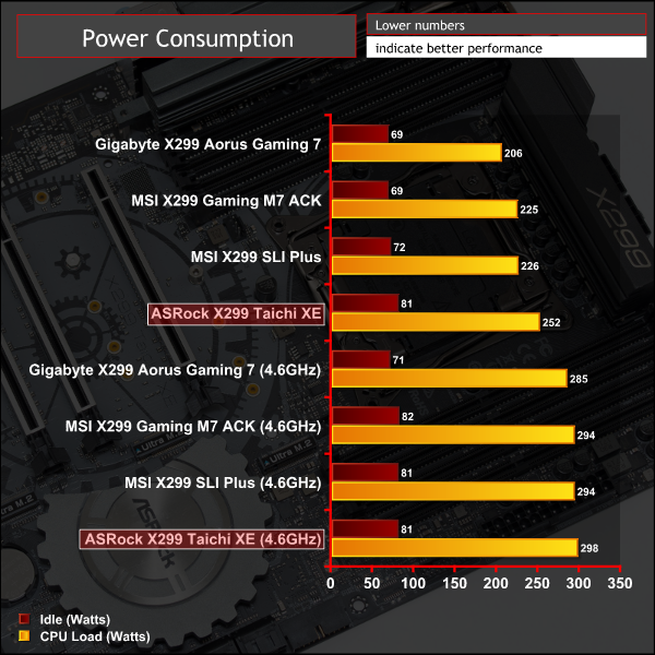 The ASRock motherboard seemed to consume more power at equivalent voltages to rival motherboards (e.g. the ASRock board consumes more at 1.2 volts than the Gigabyte or MSI boards) thus the power saved from voltage reduction during overclocking (down to 1.175v) was cancelled out by the higher overall power consumption resulting in similar power consumption at overclocked load.