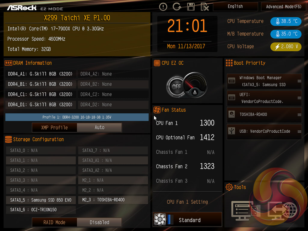 Like all motherboard vendors the ASRock UEFI offers an “EZ MODE” option (read: easy mode) intended to provide a quick summary of commonly accessed UEFI options like boot order, XMP memory profiles and fan speeds.