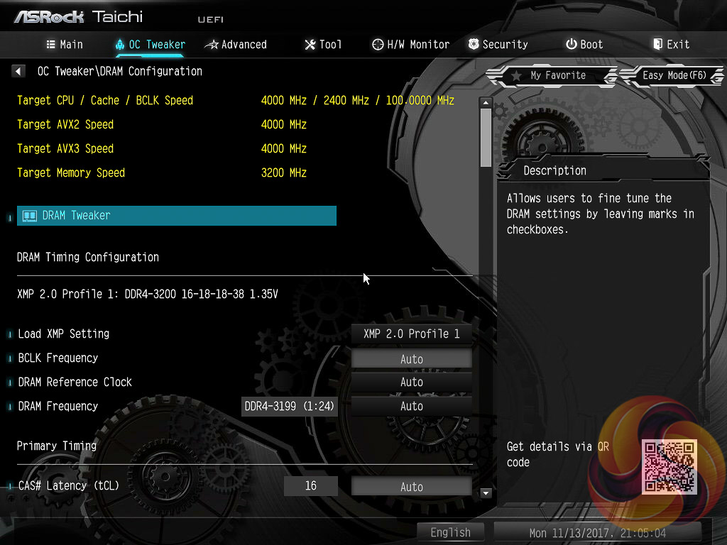 DRAM configuration brings all frequency and performance-related elements for the memory modules including XMP, reference clock and timing controls.