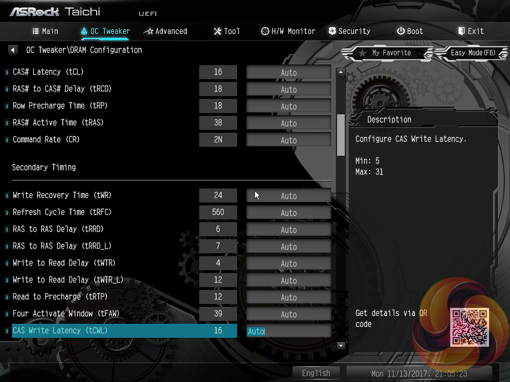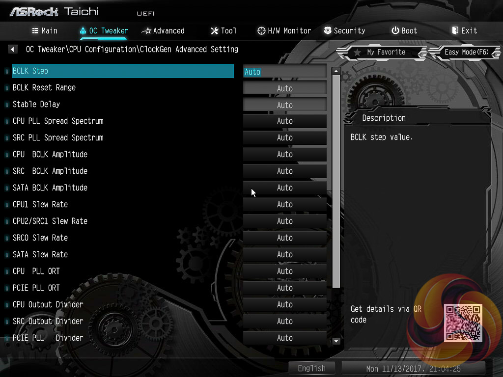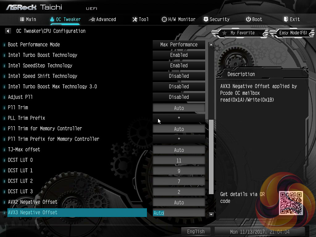 OC Tweaker is the primary section of the UEFI environment for overclocking and performance tuning. ASRock splits off the main parameters into separate sections with CPU, DRAM, Voltage and FIVR configurations.