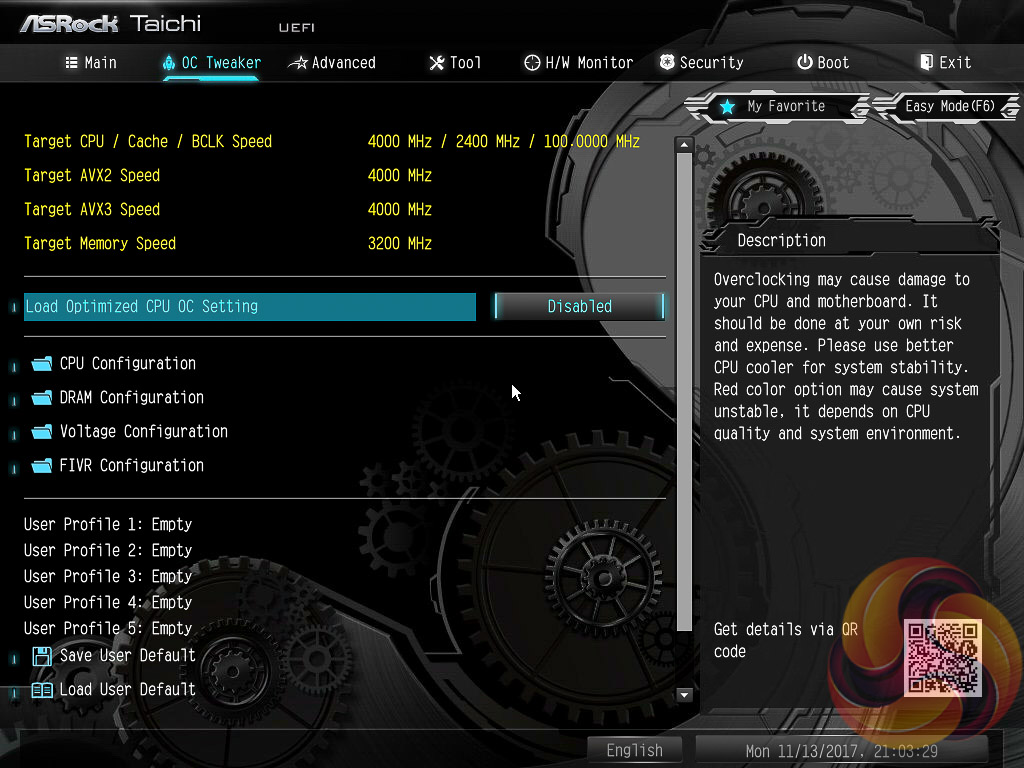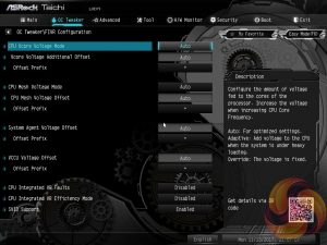 The OC Tweaker section is reasonably well equipped and granular but we find the splitting off into “FIVR” and “Voltage” unnecessarily separates clearly related UEFI options. What ASRock is trying to do is reasonably sensible and by packing related options into individual sections a neat layout does ensue, it also enables ASRock to bundle UEFI profiles into the OC Tweaker landing page so users are more likely to take note of this capability.