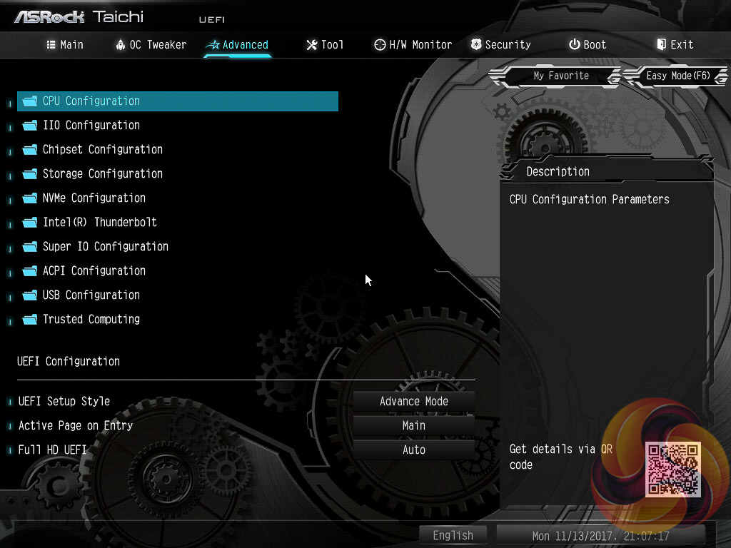 In the Advanced section are yet more CPU configuration options, as if the CPU configuration section of OC Tweaker wasn't enough. The remit of the advanced section is to give users the “everything else” of compatibility and functional UEFI options for onboard hardware that aren't found in OC Tweaker. An inclusion at the bottom of the Advanced section is the ability to toggle the UEFI into a full HD mode which is disabled by default, at least it was on our test system monitor.