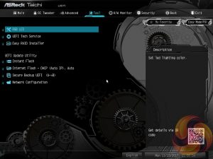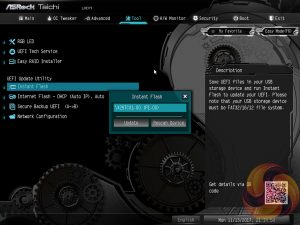 The Tool tab holds the Instant Flash utility which is beautifully simple. Attach a USB device, pick the update file and update, or update automatically from the internet. It seemed on this motherboard only one of the Ethernet ports was configured to work with Internet flash, the Intel I211AT nearest the BIOS flashback button. However, it connected up to the internet easily and worked a treat to run the update.