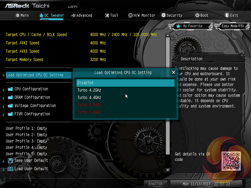 ASRock builds in four OC profiles at 4.2, 4.4, 4.6 and 4.8GHz using varying voltages. For 4.2 and 4.4GHz the VCore is left at Auto with a Level 2 Load Line Calibration and 1.9 VCCIN. Choosing the 4.6 or 4.8GHz profiles raises the VCCIN to 2.0 and 2.1v or the VCore to 1.26v and 1.32v, respectively, maintaining the Level 2 LLC. ASRock does not manipulate the cache (flex) ratio in any way with these preset OC profiles.