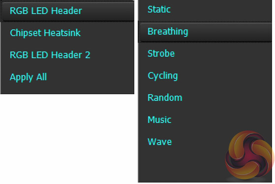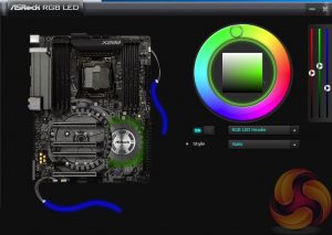 The ASRock AURA RGB LED software allows you to individually tune the main LED regions of the motherboard which are the Chipset heatsink (onboard LEDs) and two RGB LED headers (both optional and not included). It works by selecting the colour on the outer ring first, then the inner ring after and then you can pick the style from the drop down menu, there are currently 7 modes as shown above.