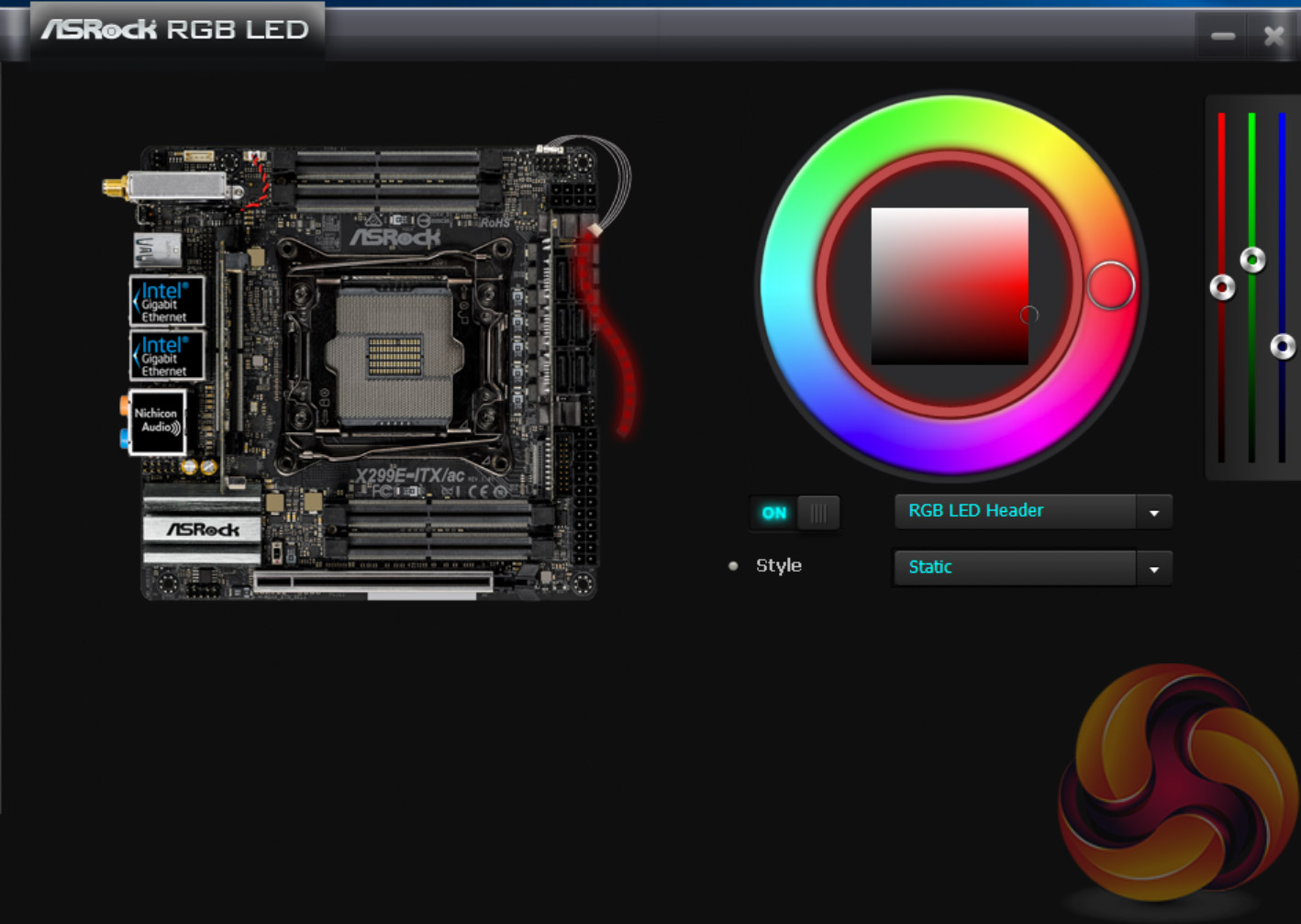 The ASRock AURA RGB LED software allows you to individually tune the LED regions of the motherboard which is only a single RGB header for this motherboard. It works by selecting the colour on the outer ring first, then the inner ring after and then you can pick the style from the drop down menu, there are currently 7 modes as shown above.
