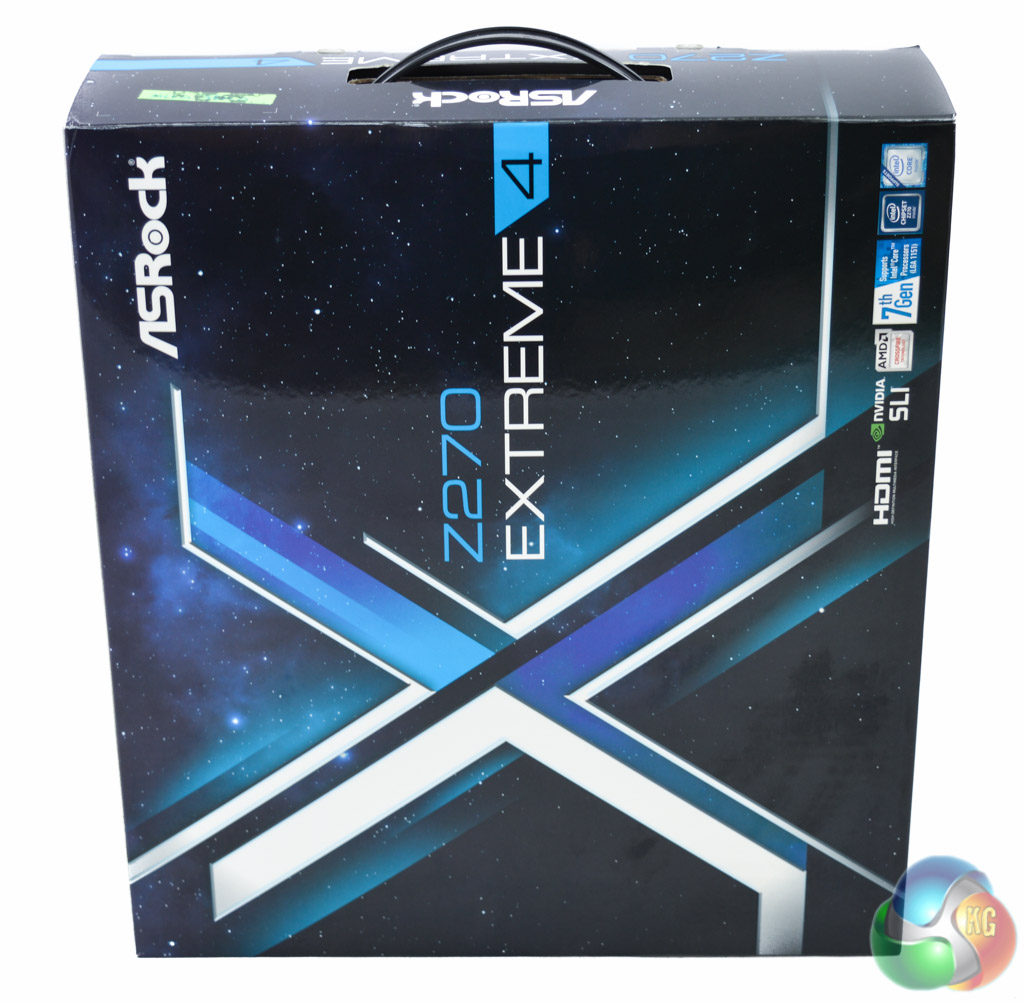 ASRock's Z270 Extreme4 is presented in a large retail package complete with convenient carry handle. The company's marketing is well-executed as the box gives a clear and concise summary of the main selling points for this motherboard.