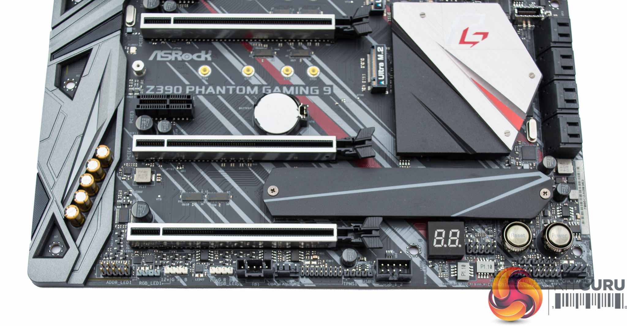 The ASRock Z390 Phantom Gaming 9 is fairly reminiscent of other Intel 300-series Fatal1ty series products in its appearance, such as the Fatal1ty H370 Performance. It's colour scheme is a mixture of black, grey and silver with subtle red accenting and there's a stylised rear I/O cover and heatsinks.