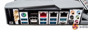 The rear I/O is well equipped with ample networking, the red LAN port is the 2.5 Gigabit LAN connection, as well as ample USB including Type-C and 10Gbps ports. ASRock has added a pair of display ports capable of 4K UHD including DisplayPort 1.2 which can do 4K at 60Hz, though the HDMI port is only HDMI 1.4b so is limited to 30Hz at 4K. The small button is to clear the CMOS and makes for a complete diagnostic and tweaking package.