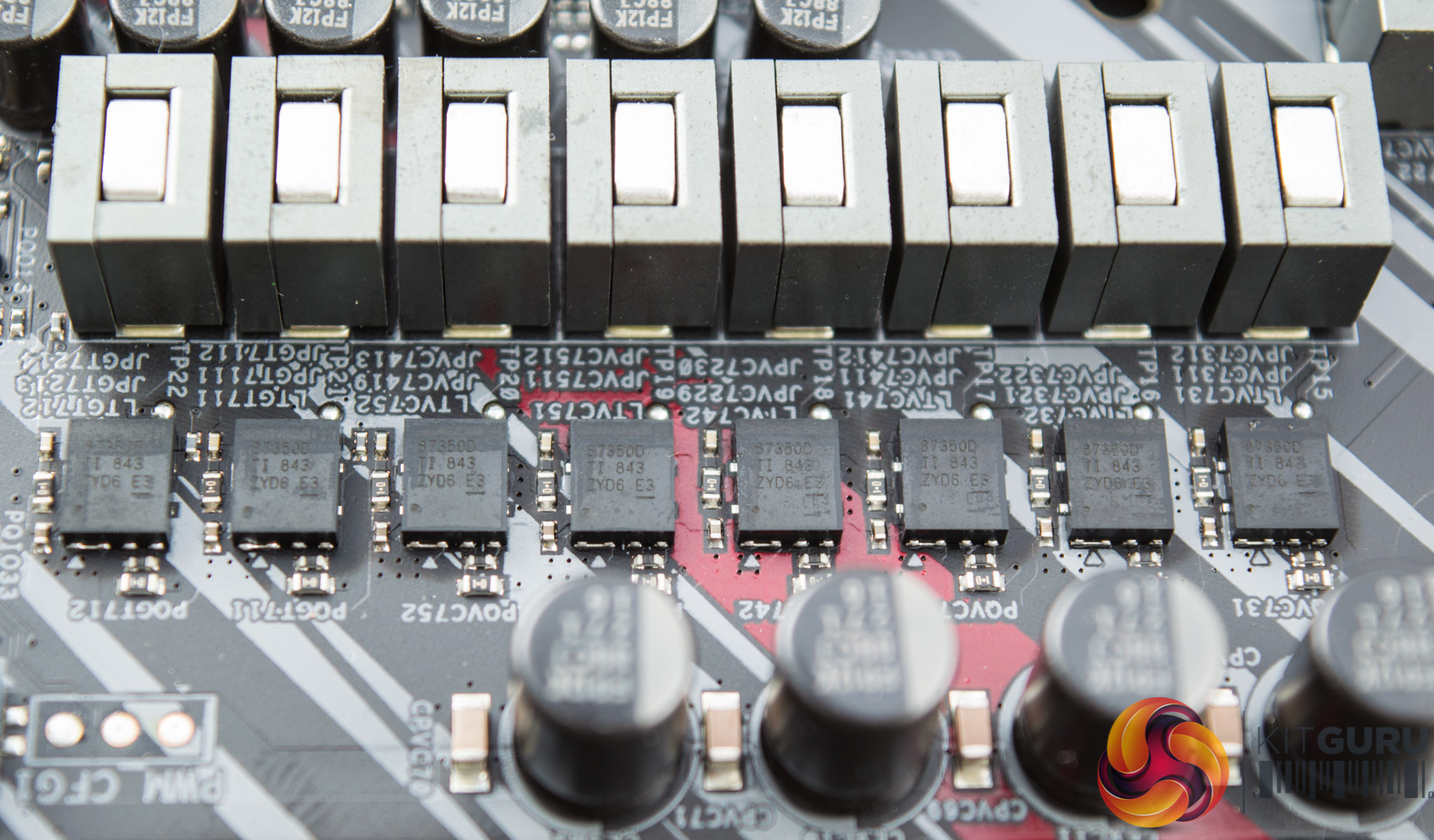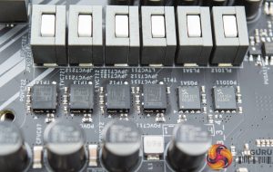The CPU PWM Controller is the Infineon IR35201 controller. It supports up to 8+0 or 6+2 phases but in this particular implementation it runs as 5+2 phases actual, 10+2 phases virtual.